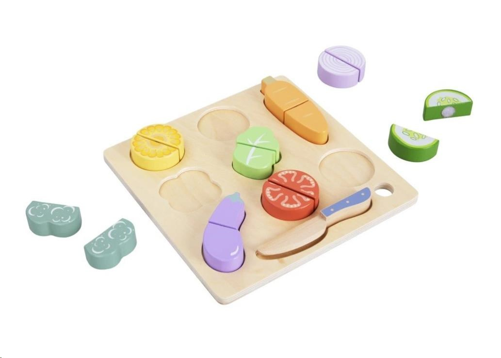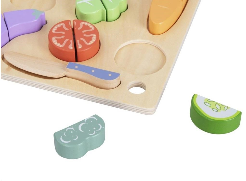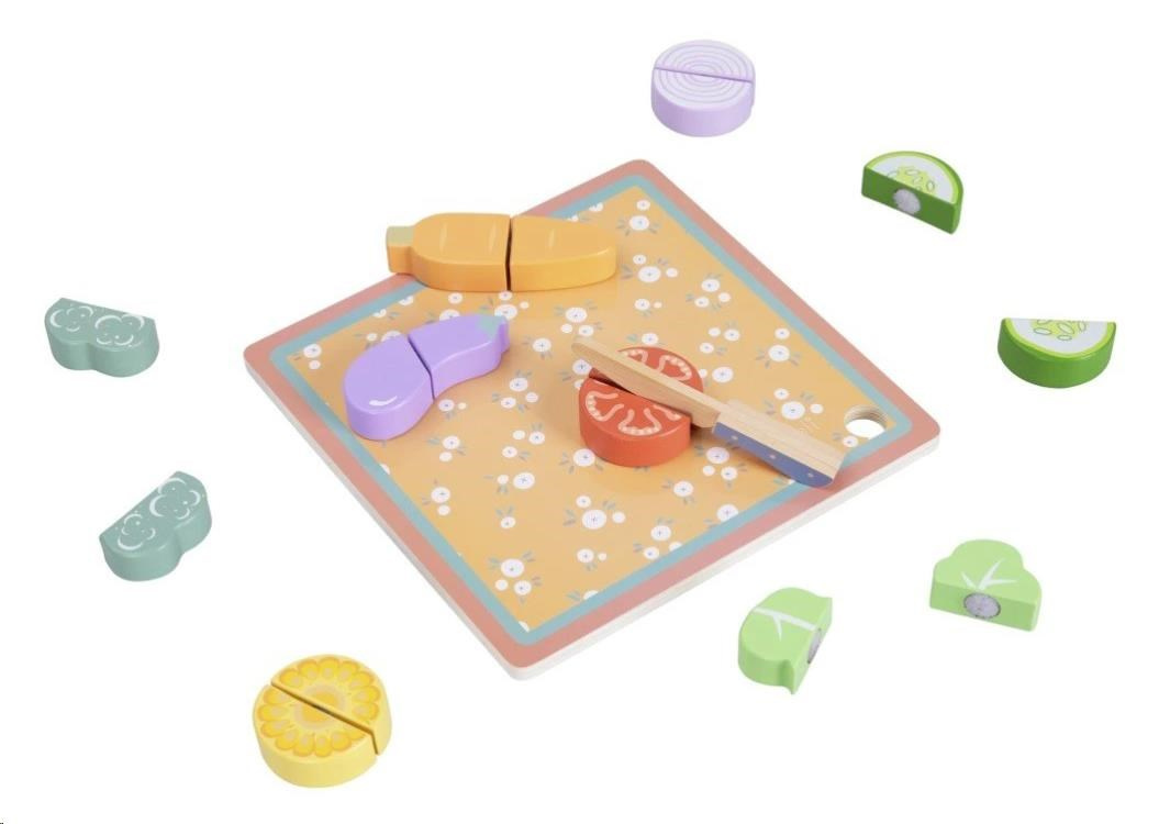 Dřevěná zelenina ke krájení je hračkou, která by neměla chybět v žádné dětské kuchyňce ani dětském obchůdku. 9 druhů zeleniny je rozděleno na poloviny spojené suchým zipem, díky kterému děti zeleninu dřevěným nožem jednoduše rozkrojí. Toto krájení zdokonalí motorické dovednosti a manuální zručnosti, děti si vyzkouší krájení bezpečným dětským způsobem. Balení obsahuje dřevěnou zeleninu, dřevěné prkénko i dřevěný nůž.