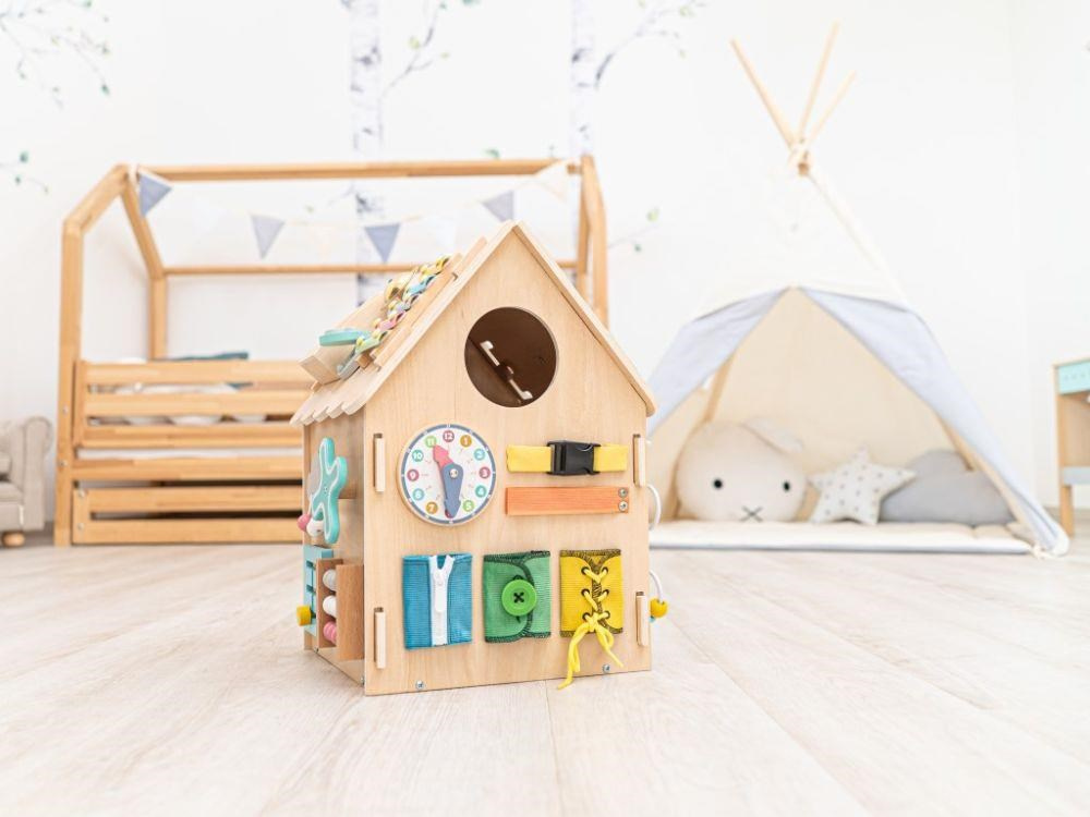 Domeček activity board v přírodním (natur) provedení, s montessori a hracími prvky, s volantem a dalšími zajímavými doplňky láká děti k prozkoumání, ke hře a k učení se. Dřevěný activity board domeček je hračkou i výukovou pomůckou. Při hře děti přirozeným způsobem zdokonalují své dovednosti, učí se novým a užijí si spoustu zábavy..
