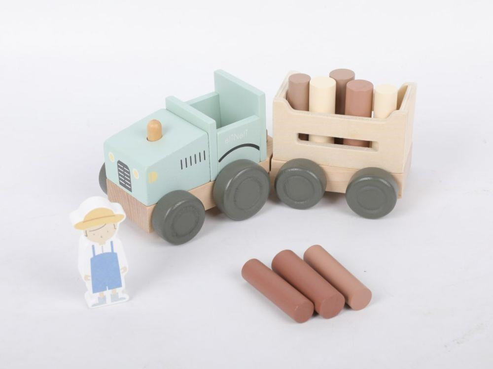 Parádní dřevěný traktor v jemné zelenkavé barvě, s traktoristou, vlečkou a nákladem v podobě klád (dřevěný válečků), promění děti ve skutečné farmáře. S tímto dřevěným traktorem se děti vydají do lesa na dříví, mohou převážet zvířátka z farmy a jakékoliv jiné hračky, kostky, co se jim podaří na vlečku naložit. Při hře s traktůrkem děti hrají role, zdokonalují motorické dovednosti a koordinaci očí a rukou..