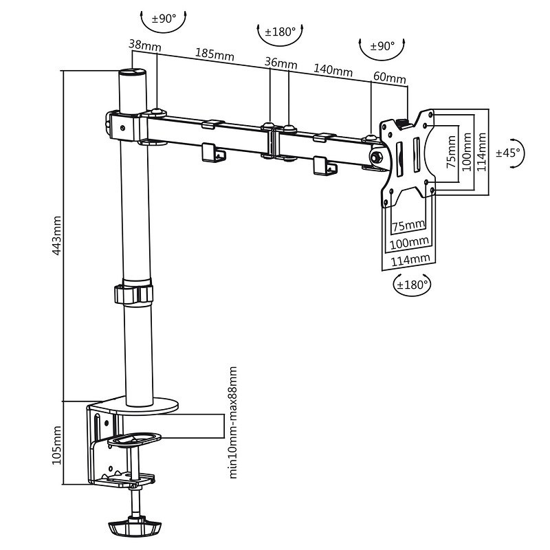 Držák monitoru na stůl Fiber Mounts M7C53 Stolní držák na monitory 13-32", otočný +/-180°, náklon +/-45°, výškové polohování 0-400mm, vedení kabeláže, 2 typy stolních úchytů, VESA 75x75 a 100x100, nosnost 8kg Kvalitní držák na monitor s uchycením na stolovou desku - 2 typy uchycení součástí balení. Držák umožňuje monitor po zavěšení výškově polohovat, otáčet bez omezení do stran, naklápět. Držák podporuje VESA standardy 75x75 a 100x100, nosnost je 8kg. Barevné provedení černé. Balení obsahuje instalační materiál. Kvalitní polohovatelný stolní držák na monitor Fiber Mounts M7C53 Vám umožní monitorem otáčet do stran, naklápět ho, vysouvat dopředu nebo zasouvat k uchycení, výškově polohovat. Technické údaje: nosnost 8kg na monitory s úhlopříčkou 13" až 32" (33cm až 82cm) držák podporuje VESA standardy 75x75 a 100x100 maximální vzdálenost od nosníku 459mm nastavení vzdálenosti od nosníku dle potřeby otáčení do stran dle potřeby +/- 180° nastavení náklonu +/- 45° součástí balení jsou 2 typy úchytů na stolovou desku úchytky na kabeláž solidní kvalita barevné provedení černé záruka 5 let Držák monitoru Fiber Mounts M7C53 podporuje VESA standardy: VESA 75x75 VESA 100x100.