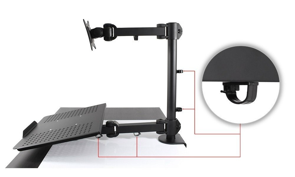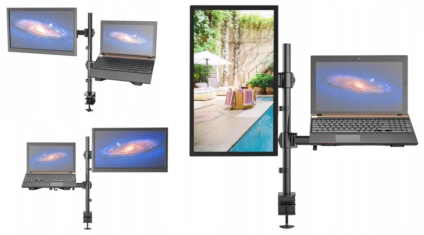 Držák notebooku nebo laptopu a monitoru Fiber Mounts FM23 Kvalitní sestava stolní držák na monitor 15-27" a držák na notebook laptop 13-17", polohovatelný, stabilní a pevný Vybavte si kancelář skvělým pomocníkem, který Vám uspoří spoustu místa a zlepší ergonomii při práci. Sestava Fiber Mounts FM23 obsahuje držák na monitory 15-27" a držák na notebooky nebo laptopy s úhlopříčkou 13-17". Držák monitoru podporuje VESA 75x75 a 100x100, lze ho otáčet do stran, naklápět, rotovat a výškově polohovat. Držák notebooku lze otáčet do stran a výškově polohovat. Barevné provedení černé, celková nosnost 20kg, celokovová konstrukce. Stolní držák na monitor a notebook do vaší kanceláře - Fiber Mounts FM23 Technické údaje: nosnost 20kg na monitory 15-27" na notebooky 13-17" VESA standard 75x75 a 100x100 otáčení do stran +/- 135° naklápění monitoru +/- 90° uchycení na stolové desky s tloušťkou 10-100mm barva černá záruka 3 roky Stolní držák na monitor a notebook do vaší kanceláře - Fiber Mounts FM23 Držák na monitory podporuje standardy VESA: VESA 75x75 VESA 100x100.