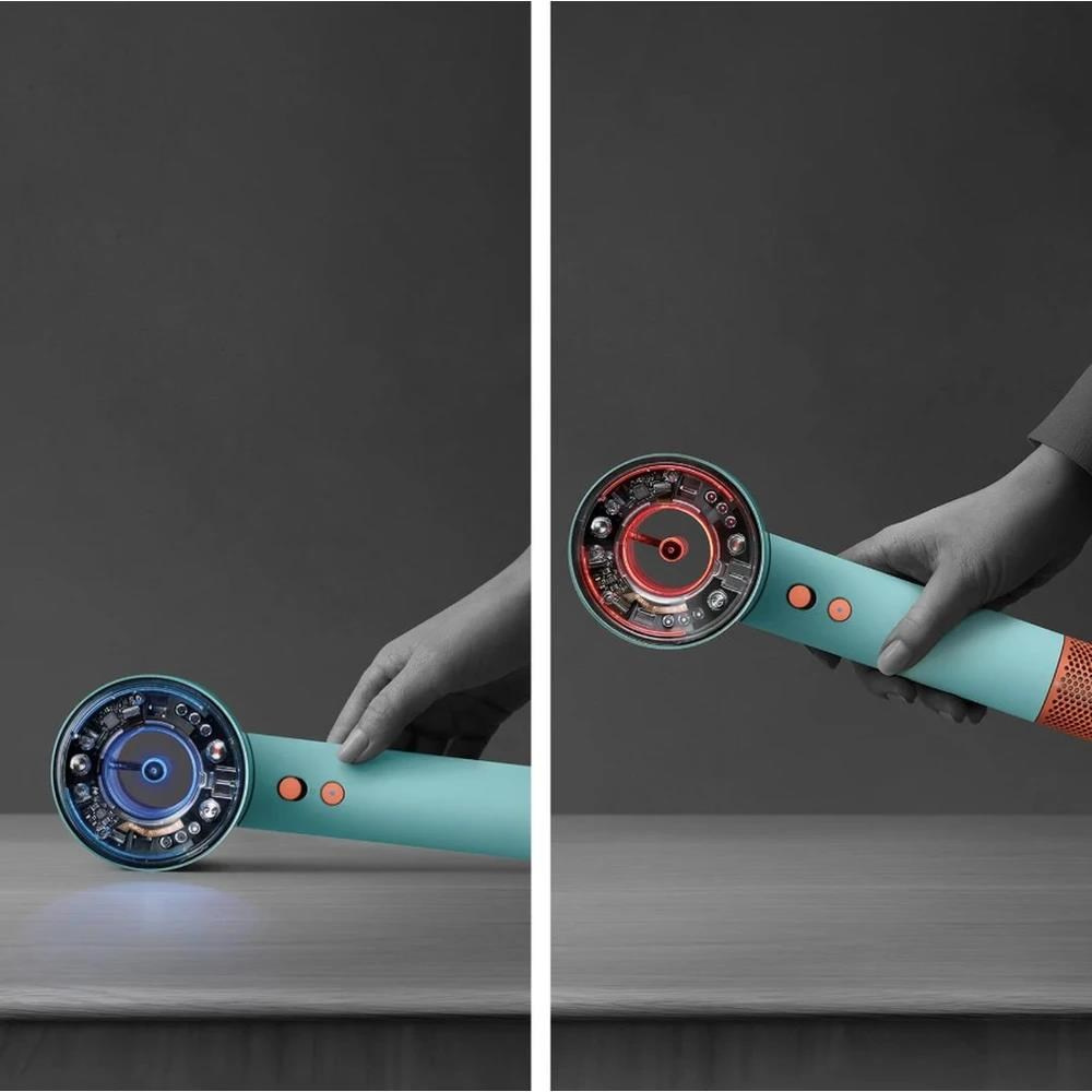 Fén má navíc akcelerometr, který detekuje pohyb a pozná, kdy je stroj položen. Ten vzápětí deaktivuje topení a sníží proudění vzduchu.