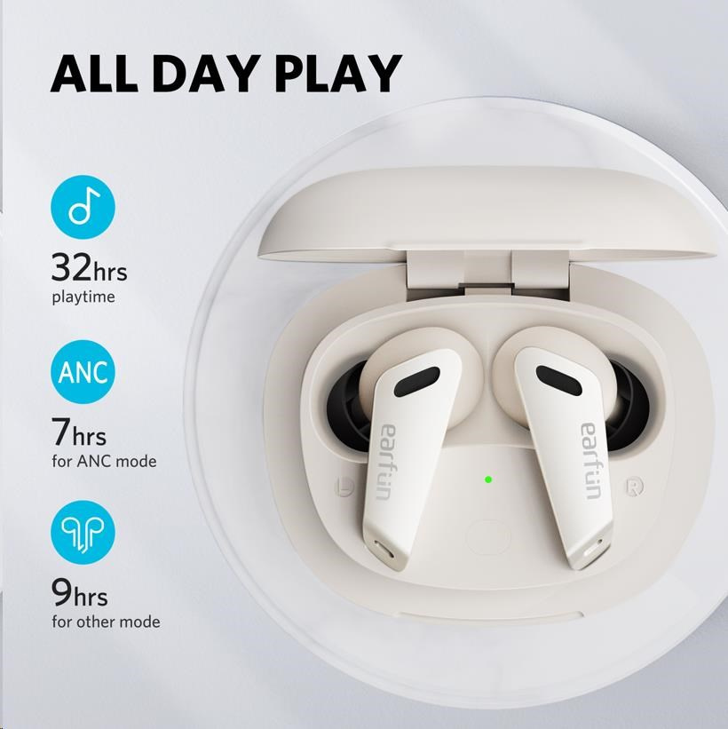| Playtime | Other Mode - Up to 9 hours, Totally 32 hours with the charging case; (varies by volume level and audio content) ANC Mode- Up to 7 hours, Totally 25 hours with the charging case; (varies by volume level and audio content) |