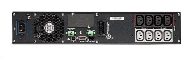 | Obsah balení | UPS Karta pro síťovou správu (2) Výstupní IEC-IEC kabely USB kabel Sériový kabel (2) držáky pro montáž do 19’ rozváděče (2) Sada pro montáž do skříně (2) Podpěry pro samostatně stojící montáž Systém pro uchycení kabelu Bezpečnostní pokyny Stručná příručka |