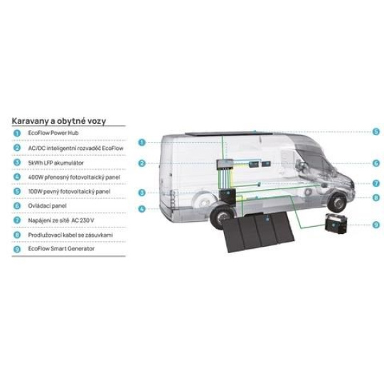 Power Hub umožňuje připojovat kombinaci až 4 vstupů s celkovým výkonem až 6000 W. Využijte kombinaci solárních panelů, generátorů pro vaše ostrovní systémy. Dobíjet můžete Power Kit i karavanu ze sítě AC 230 V nebo Power Kit připojit k alternátoru vozidla.