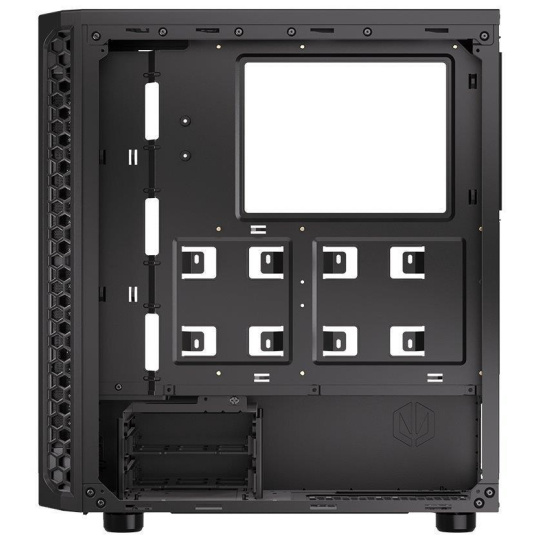 Skříň formátu Middle Tower nabízí dvě 2,5" pozice pro SSD disky a dvě 3,5" pozice pro pevné disky. Na horní části se nachází dva USB 3.0 porty, sluchátkový výstup a audio vstup pro mikrofon. Vybavena je jedním 120 mm ventilátorem, který spolu s perforovaným čelním panelem zajišťuje dostatečné proudění vzduchu. Důmyslné řešení umožňuje pohodlné umístění až 360 mm dlouhého výměníku vodního chlazení na přední straně. Ve skříni je dostatek prostoru pro chladič CPU do výšky až 161 mm a grafickou kartu o délce až 350 mm. Dodávána je bez zdroje. Součástí je také sada prachových filtrů.