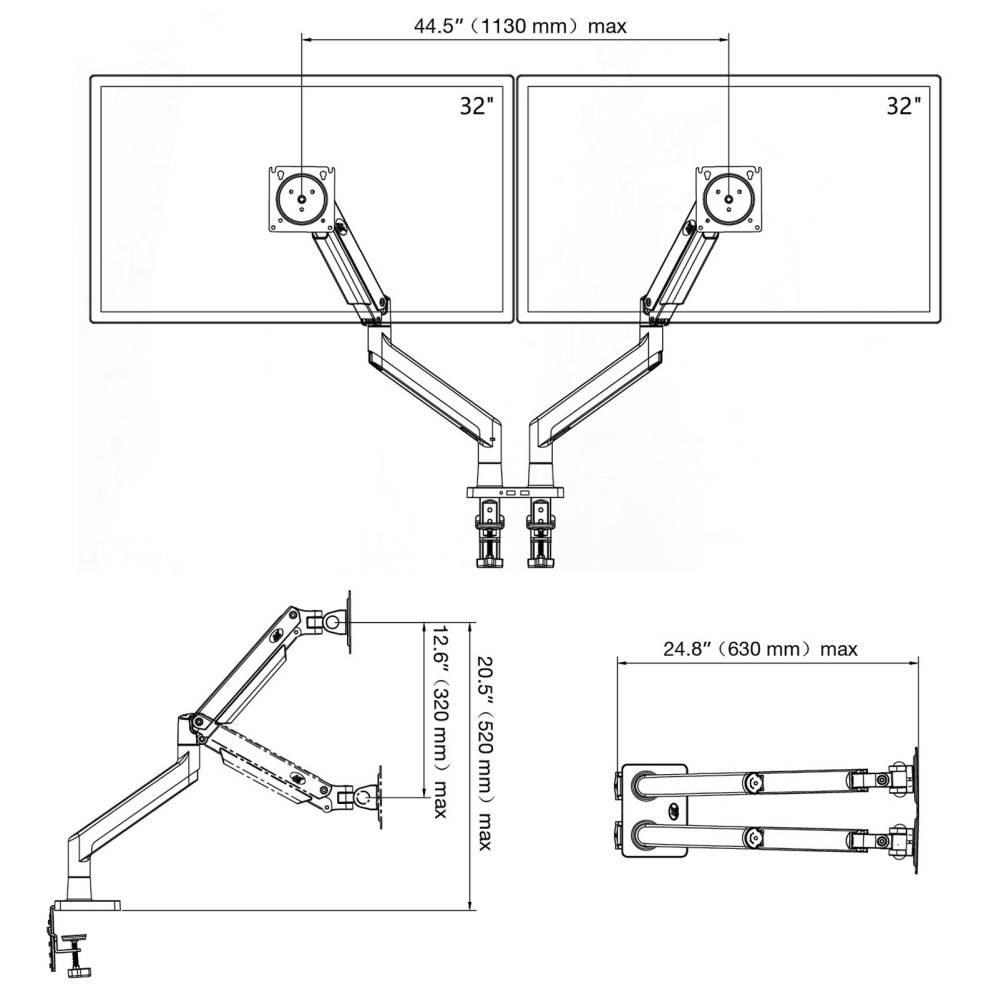Profesionální stolní držák na 2 monitory 17-32", nastavitelná výška 200-520mm, otočný +/-360°, náklon +85°/-30°, max. vzdálenost 630mm, PIVOT, USB port, vedení kabeláže, VESA 75x75 a 100x100, nosnost 30kg.... více