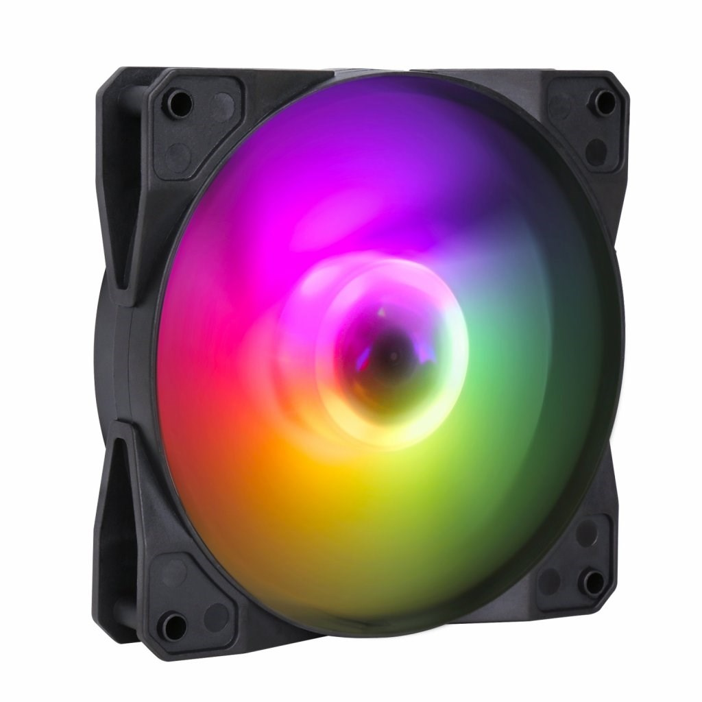 ARGB LED ventilátor typu rainbow s LED diodami. Ventilátor umožňuje najednou zobrazit všech sedm barev duhového spektra. Jedná se o podřízený ventilátor, který je určen pro použití s ventilátorem EVOLVEO 12FM. LED osvětlení je ovládáno pomocí tlačítka reset nebo LED tlačítka na ovládacím panelu skříně nebo připojením přiloženého ARGB kabelu k základní desce.