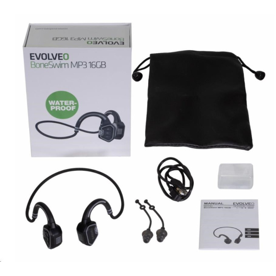 | Obsah balení | EVOLVEO BoneSwim MP3 sluchátka Ochranný přenosný obal Magnetický napájecí kabel Ucpávky do uší v krabičce + uchycení Uživatelský manuál |