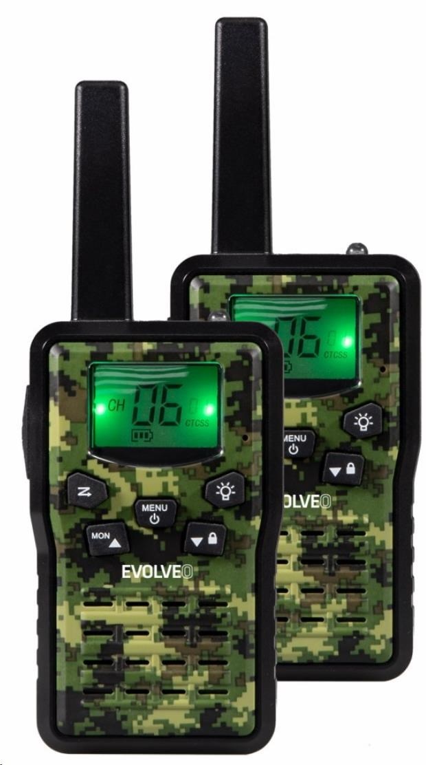 Sada vysílaček, které dokáží pracovat v režimu PMR 446 (446MHz) s výkonem 0,5W, ale též na frekvenci 448MHz s výkonem 2W. S výkonnou baterii s kapacitou 1300mAh se můžete vydat i na vícedenní výpravu a stále budete ve spojení. Pro komunikaci je 8 dostupných kanálů, z nichž každý je možné dále provozovat se 121 kódy (38 kódů CTCSS a 83 kódů DCS). Kódy se používají pro odfiltrování cizích účastníků vysílajících na stejném kanále. Walkie talkie obsahuje také funkci monitorování kanálu, údaje jsou zobrazovány na velkém a přehledném displeji.
