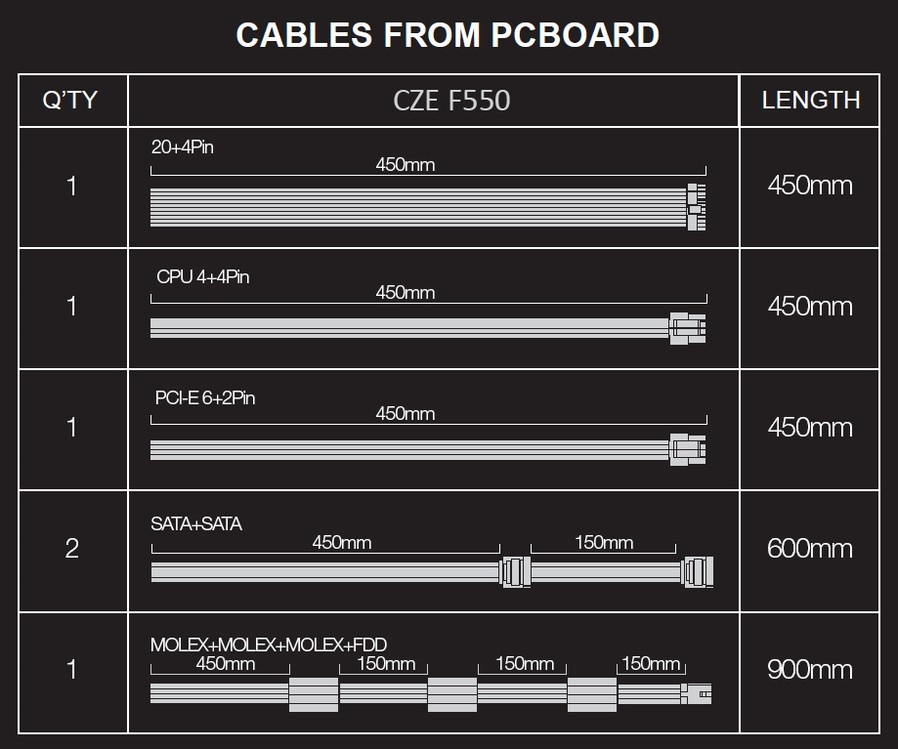• 1x MOLEX, 450mm + MOLEX 150mm + MOLEX 150 mm + FDD 150 mm