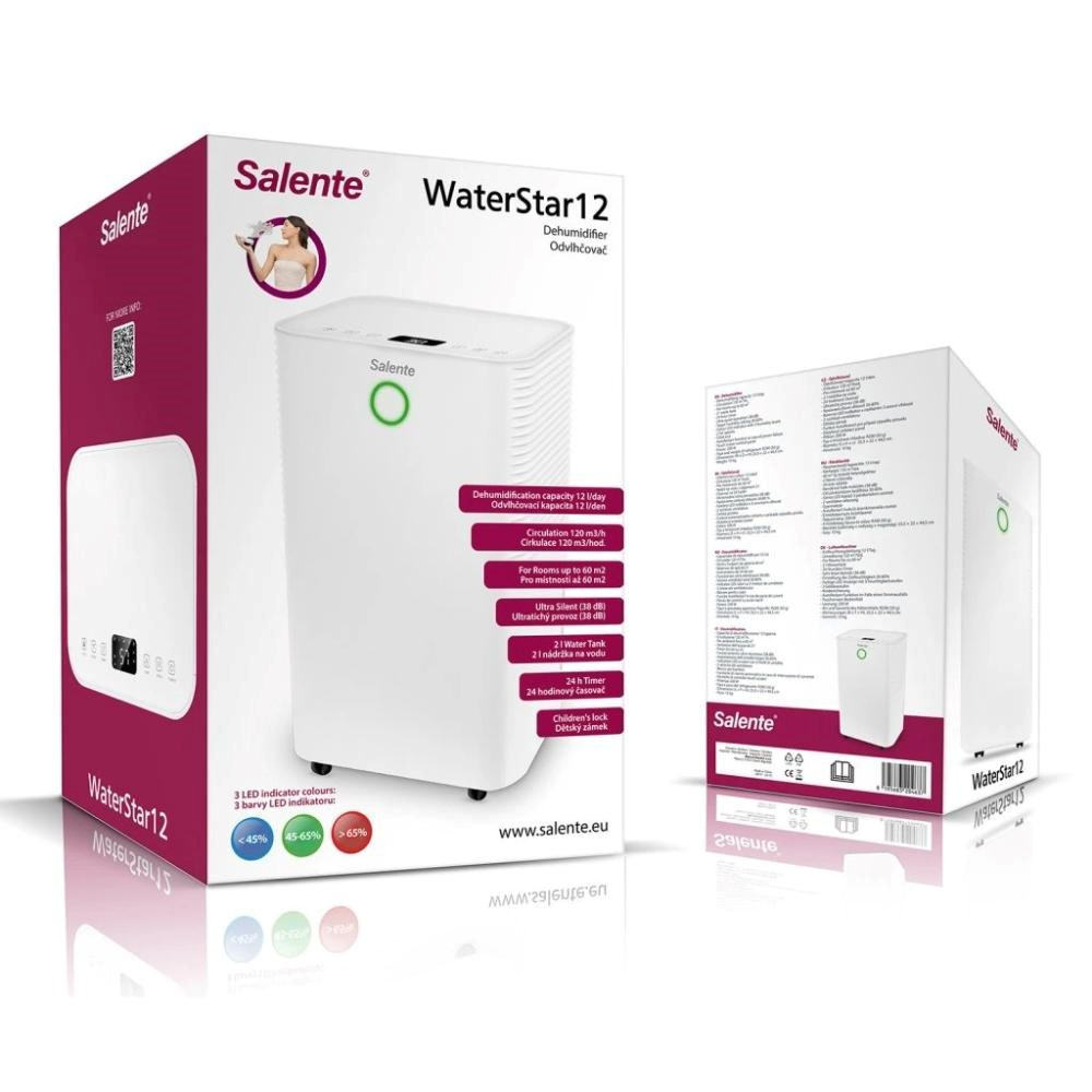 Salente WaterStar12 je skutečným hrdinou v boji s vlhkostí. Tento moderní odvlhčovač můžete využít v jakékoliv místnosti do velikosti 60 m2 – efektivně si poradí s problémy, jako jsou plísně, zatuchlý vzduch, orosená okna nebo nadměrná vlhkost způsobená přetápěním.