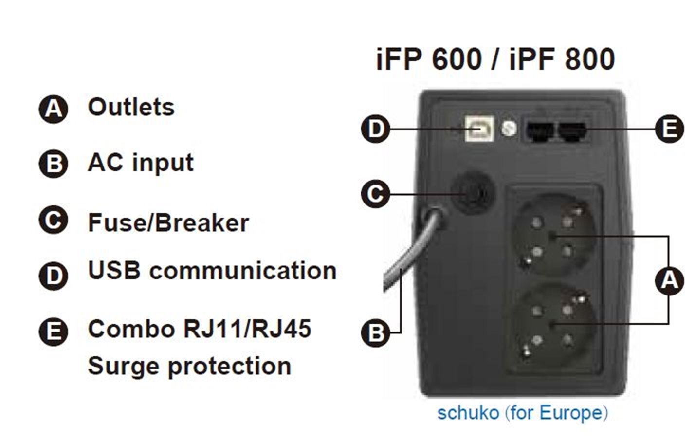- Typ výstupních zásuvek: 2 x Schuko zásuvka