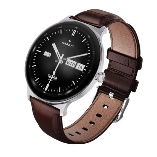 - Sada obsahuje: smartwatch GARETT, náhradní kožený řemínek (černý / hnědý dle varianty), nabíjecí základna USB, QSG návod