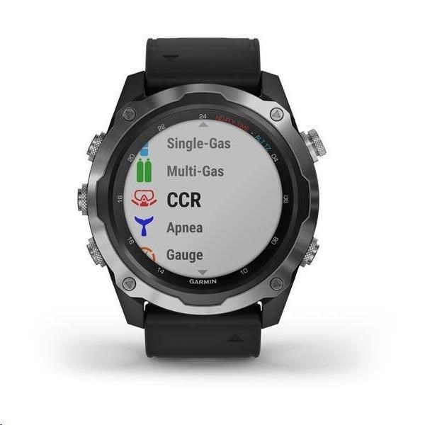Potápěčský počítač s funkcemi chytrých a sportovně všestranných GPS hodinek, s mapami, MP3 hudbou a bezkontaktními platbami Garmin Pay. Safírové sklo, ocelová luneta, silikonový řemínek.