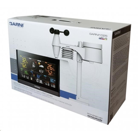 Wi-Fi meteorologická stanice model GARNI 1025 Arcus 2GEN s integrovaným bezdrátovým čidlem 7-v-1, která je vybavena mnoha funkcemi shromažďuje přesné a podrobné údaje o počasí. Integrované bezdrátové čidlo pracuje na frekvenci 868 MHz a měří vnější teplotu a relativní vlhkost, rychlost a směr větru, dešťové srážky, barometrický tlak, UV index a intenzitu slunečního záření. Výrobek používá vysoce přesná švýcarská čidla SENSIRION a umožňuje kalibraci některých meteorologických veličin.