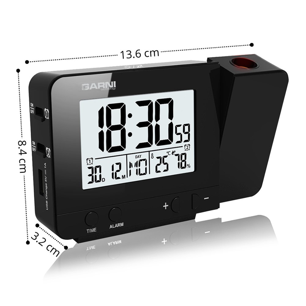 Digitální budík s projekcí času a vnitřní teploty s LCD displejem, časem řízeným rádiovým signálem DCF-77 a měřením vnitřní teploty a relativní vlhkosti LCD displej o rozměrech 63 x 42 mm s možností stálého osvětlení při napájení síťovým adaptérem, nebo krátkodobým osvětlením na 8 s při napájení bateriemi 3 stupně jasu osvětlení displeje, možnost vypnutí osvětlení displeje (při napájení síťovým adaptérem) velikost číslic na displeji – čas 25 mm, datum, zkratka názvu dne, vnitřní teplota a rel. vlhkost 8,5 mm čas a datum řízené signálem DCF-77 s možností manuálního nastavení ikona příjmu signálu DCF-77 zkratka názvu dne 12ti, nebo 24 hodinový formát zobrazení času možnost nastavení časového pásma od -12 do +12 hodin budík s 2 budícími časy s funkcí opakovaného buzení (Snooze) po 5 minutách budící signál - 10 sekund 1 pípnutí za sekundu, 10 sekund 2 pípnutí za sekundu, 10 sekund 4 pípnutí za sekundu a poté stálé pípání projekce času a vnitřní teploty s možností otočení obrazu o 180°, možnost sklopení tubusu projektoru o 90° dopředu a dozadu barva projekce červená stálá projekce při napájení síťovým adaptérem s možností vypnutí zobrazení hodnot vnitřní teploty a relativní vlhkosti zobrazení teploty ve °C, nebo °F USB port pro nabíjení mobilních zařízení (pouze při napájení hlavní jednotky síťovým adaptérem), maximální nabíjecí proud 1 000 mA napájení síťovým adaptérem, nebo bateriemi možnost postavení barva černá Obsah balení: 1 x digitální budík GARNI 140 1 x síťový adaptér český, slovenský, německý, anglický, italský, polský a maďarský návod.