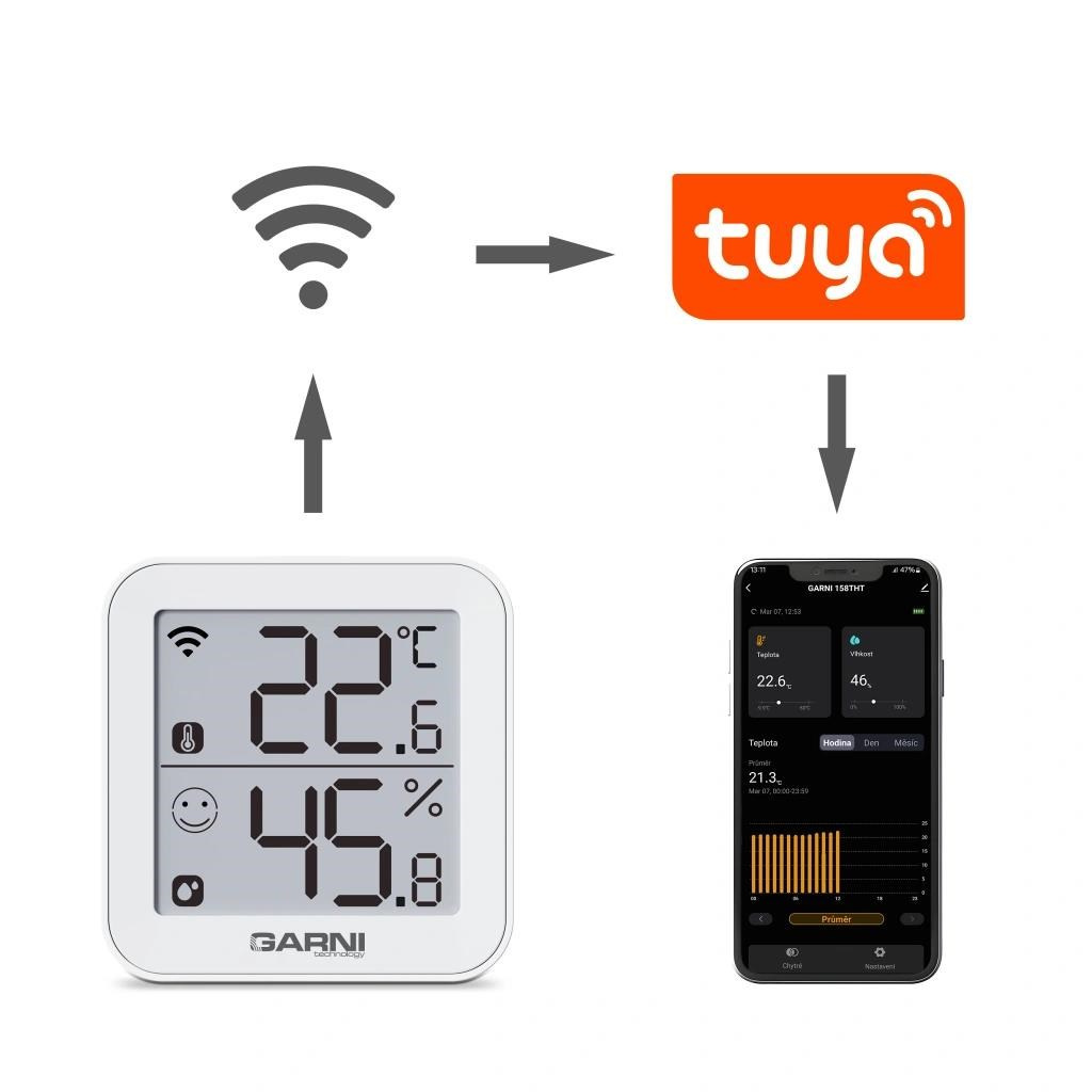 Chytrý vnitřní digitální teploměr s vlhkoměrem model GARNI 158THT má vestavěný modul Wi-Fi a prostřednictvím svého chytrého systému je kompatibilní s platformou Tuya IOT. Pomocí aplikace Tuya Smart můžete sledovat vnitřní teplotu a relativní vlhkost, prohlížet historii záznamů, nastavovat alarmy pro dané veličiny, spouštět pokročilé funkce za pomocí naměřených hodnot a naměřená data odeslat na email v Excel souboru. Je možné jej propojit s dalšími produkty chytré domácnosti, ovládání pak probíhá přes aplikaci v mobilním zařízení. Podporuje integraci do Google Assistant a Alexa.