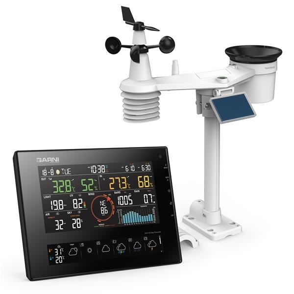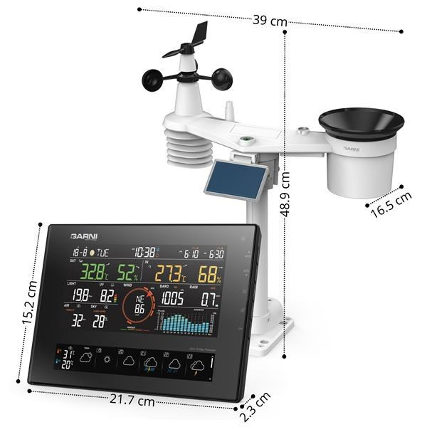 Integrované bezdrátové čidlo 7-v-1 GARNI 1NG měří vnější teplotu a relativní vlhkost, rychlost a směr větru, dešťové srážky, UV index a sluneční záření, a data jsou odesílána do hlavní jednotky až do vzdálenosti 150 m (v otevřeném prostoru). Napájení zajišťuje zajišťuje vestavěný kapacitor, který je nabíjen pomocí vestavěného solárního panelu. Baterie slouží jako záložní zdroj. Čidla jsou kompletně smontovaná a kalibrovaná tak, aby pro vás byla instalace co nejjednodušší. Hlavní jednotka je osazena snadno čitelným displejem VA displejem s ultračerným pozadím s možností automatické regulace jasu, který kromě dat ze všech připojených čidel (např. čidla pro měření teploty a relativní vlhkosti, bazénové čidlo, čidlo vlhkosti a teploty půdy, čidlo detekce blesků, čidlo kvality vzduchu) zobrazuje předpověď počasí, barometrický tlak, indexy počasí spolu s pokročilými funkcemi a informacemi, jako je výstražný alarm pro vysoké/nízké naměřené hodnoty a ztrátu spojení s čidly prostřednictvím notifikací v mobilní aplikaci a další. Vysokorychlostní procesor hlavní jednotky analyzuje naměřené hodnoty meteorologických veličin, vestavěná paměť uchovává maximální / minimální naměřené hodnoty za daný den nebo od počátku měření, a automaticky seřizuje čas a datum z internetu. Díky jednoduchému ovládání, snadné údržbě, možnosti kalibrace, zobrazení času východu a západu Slunce a Měsíce, zobrazení fází Měsíce, automatické regulaci jasu displeje, množství měřených veličin a dlouhodobé předpovědi se jedná o výjimečnou profesionální meteorologickou stanici pro váš domov.