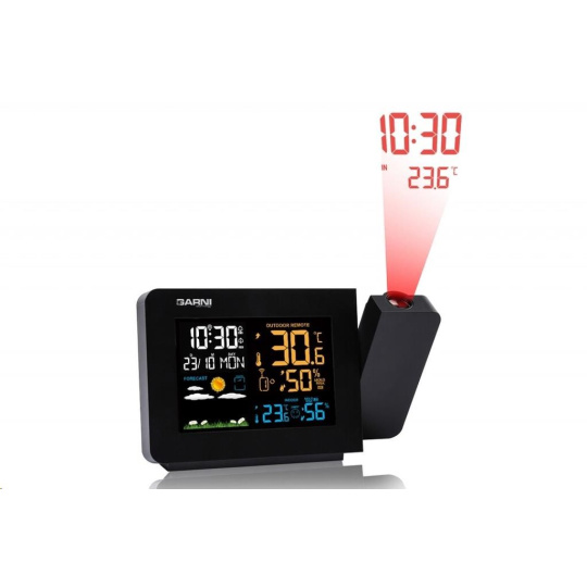 Meteorologická stanice se špičkovým inverzním barevným VA displejem s časem řízeným rádiovým signálem DCF-77, budíkem, měřením vnitřní teploty a relativní vlhkosti, bezdrátovým čidlem pro měření vnější teploty a relativní vlhkosti a projekcí času a vnitřní / venkovní teploty inverzní barevný VA displej o rozměrech 94 x 63 mm s možností stálého osvětlení 3 stupně jasu osvětlení displeje, možnost vypnutí osvětlení displeje s možností krátkodobého osvětlení na 15 s velikost číslic na displeji – čas 13 mm, datum, zkratka názvu dne 7 mm, vnitřní teplota a relativní vlhkost 10 mm, vnější teplota 20,5 mm, vnější relativní vlhkost 13 mm čas a datum řízené signálem DCF-77 s možností manuálního nastavení ikona příjmu signálu DCF-77 zkratka názvu dne 12ti, nebo 24 hodinový formát zobrazení času možnost nastavení časového pásma od -12 do +12 hodin budík s 2 budícími časy s funkcí opakovaného buzení (Snooze) nastavitelné od 5 do 60 minut budící signál - 10 sekund 1 pípnutí za sekundu, 10 sekund 2 pípnutí za sekundu, 10 sekund 3 pípnutí za sekundu a poté stále 4 pípnutí za sekundu střídavá projekce času a vnitřní a vnější teploty (teploty se střídají co 5 s) s možností otočení obrazu o 180°, možnost sklopení tubusu projektoru o 90° dopředu a dozadu barva projekce červená 2 stupně jasu a možnost vypnutí projekce 6 animovaných ikon předpovědi počasí (slunečno, polojasno, oblačno, srážky, silný déšť a sněžení) na základě sledování barometrického tlaku vestavěným barometrickým čidlem možnost nastavení výchozí ikony předpovědi počasí zobrazení hodnot vnitřní a vnější teploty a relativní vlhkosti paměť na maximální a minimální naměřené hodnoty teploty a rel. vlhkosti s automatickým mazáním v 0:00 hodin šipky tendence vývoje barometrického tlaku, vnitřní a vnější teploty a rel. vlhkosti 3 stupně indikace stavu vnitřní a vnější relativní vlhkosti indikace námrazy vnější teploty v rozsahu od -1°C do +3°C ikonou na displeji zobrazení teploty ve °C, nebo °F zobrazení hodnoty venkovního rosného bodu a teplotního indexu pro každý kanál možnost použití až 3 bezdrátových čidel GARNI 30H (jedno čidlo GARNI 030H je součástí dodávky) funkce automatického přepínání kanálů 5 ikon vnitřní tepelné pohody bezdrátový přenos hodnot vnější teploty a relativní vlhkosti na frekvenci 433 MHz ikona příjmu signálu bezdrátového čidla ikony slabých baterií napájení síťovým adaptérem a záložními bateriemi možnost postavení barva černá Bezdrátové čidlo GARNI 030H vlhkosti odolné displej o rozměrech 19 x 11 mm velikost číslic na displeji: teplota a relativní vlhkost 4 mm měření teploty a relativní vlhkosti 3 kanály maximální RF výkon 10 dBm (10 mW) možnost postavení a zavěšení barva bílá Obsah balení: 1 x hlavní jednotka GARNI 439 Line 1 x bezdrátové čidlo GARNI 030H 1 x síťový adaptér český, slovenský, německý, anglický, italský, polský a maďarský návod.
