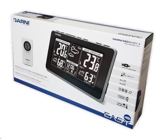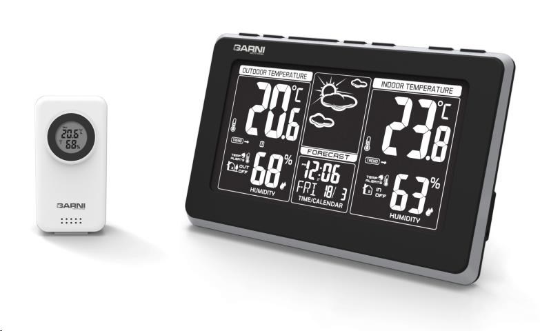 Meteorologická stanice s inverzním LCD displejem s časem řízeným rádiovým signálem DCF-77, budíkem, měřením vnitřní teploty a relativní vlhkosti, bezdrátovým čidlem pro měření vnější teploty a relativní vlhkosti a USB portem pro napájení externích zařízení. Mobilní telefon a USB kabel nejsou součástí balení - inverzní LCD displej o rozměrech 169 x 94 mm s možností stálého osvětlení při napájení síťovým adaptérem, nebo krátkodobým osvětlením na 8 s při napájení bateriemi - dva stupně jasu osvětlení displeje, možnost vypnutí osvětlení displeje (při napájení síťovým adaptérem) - při napájení pouze bateriemi lze displej rozsvítit zvukem, např. klepnutím, tlesknutím apod. - velikost číslic na displeji – čas 12,5 mm, datum a zkratka názvu dne 8 mm, vnitřní a vnější teplota 38 mm, vnitřní a vnější relativní vlhkost 23 mm - čas řízený signálem DCF-77 s možností manuálního nastavení - ikona příjmu signálu DCF-77 - 12ti, nebo 24 hodinový formát zobrazení času - možnost nastavení časového pásma od -12 do +12 hodin - budík s 2 budícími časy s funkcí opakovaného buzení (Snooze) nastavitelného od 3 do 20 minut - budící signál - 10 sekund 1 pípnutí za sekundu, 10 sekund 2 pípnutí za sekundu a poté stálé 4 pípnutí za sekundu - 13 ikon předpovědi počasí v 6 úrovních (jasno, polojasno, oblačno, déšť, bouřky a sněžení) na základě sledování barometrického tlaku vestavěným barometrickým čidlem - zobrazení hodnot vnitřní a vnější teploty a relativní vlhkosti - šipky tendence vývoje vnitřní a vnější teploty - možnost nastavení alarmu horní a dolní meze vnitřní a vnější teploty (akustickým signálem a ikonou na displeji) - zobrazení teploty ve °C, nebo °F - možnost použití až 3 bezdrátových čidel GARNI 040H (jedno je součástí dodávky) - funkce automatického přepínání kanálů - bezdrátový přenos hodnot vnější teploty relativní vlhkosti na frekvenci 433 MHz - ikona příjmu signálu bezdrátového čidla - USB port pro nabíjení mobilních zařízení (pouze při napájení hlavní jednotky síťovým adaptérem), maximální nabíjecí proud 1 000 mA - napájení síťovým adaptérem nebo bateriemi - možnost postavení, nebo zavěšení - barva černá se stříbrnou Bezdrátové čidlo GARNI 040H - vlhkosti odolné, krytí IP44 (odolné proti stříkající vodě) - kruhový displej o průměru 19 mm - velikost číslic na displeji: teplota a relativní vlhkost 5 mm - měření teploty a relativní vlhkosti - 3 kanály - maximální RF výkon 10 dBm (10 mW) - možnost postavení a zavěšení - barva bílá Obsah balení: 1 x hlavní jednotka GARNI 560 EASY II 1 x bezdrátové čidlo GARNI 040H 1 x síťový adaptér český, slovenský, německý, anglický, polský a maďarský návod.