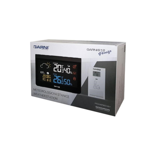 Přesná meteorologická stanice s inverzním barevným VA displejem s časem a datem řízenými rádiovým signálem DCF-77, budíkem, měřením vnitřní teploty, relativní vlhkosti, barometrického tlaku a bezdrátovým čidlem pro měření vnější teploty a relativní vlhkosti. Pro dosažení vysoké přesnosti měření teploty a relativní vlhkosti jsou použita špičková čidla švýcarské značky SENSIRION