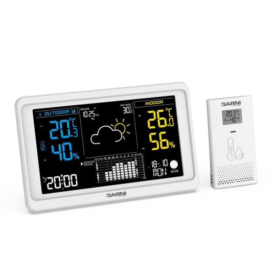 Přesná meteorologická stanice s inverzním barevným VA displejem s časem a datem řízenými rádiovým signálem DCF-77, budíkem, měřením vnitřní teploty, relativní vlhkosti, barometrického tlaku a bezdrátovým čidlem pro měření vnější teploty a relativní vlhkosti. Pro dosažení vysoké přesnosti měření teploty a relativní vlhkosti jsou použita špičková čidla švýcarské značky SENSIRION