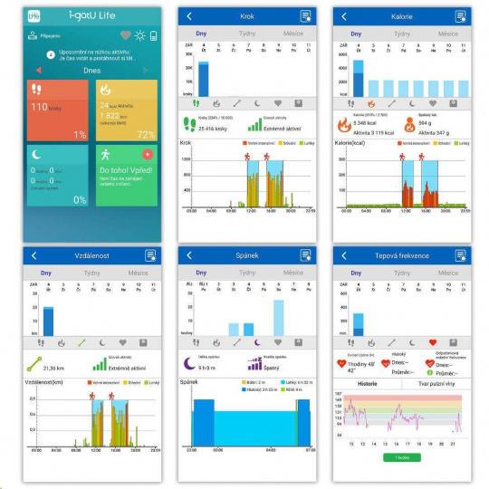 - zobrazení na náramku - datum, průběh plnění stanovených cílů, stav baterie, ikona aktuálního režimu, ikona zapnutého buzení, ikona připojení k mobilnímu zařízení aktuální čas, počet kroků, kalorie, tepová frekvence a dále ve sportovním režimu podle volby v aplikaci, až 8 zvolených údajů