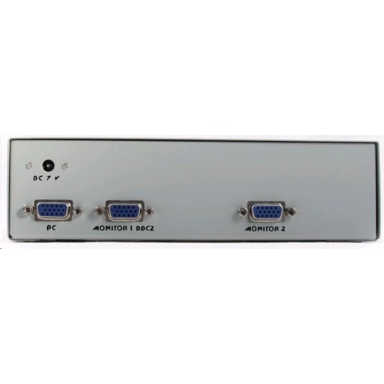 Posílá video signál z jednoho počítače na dva monitory. GVS122 VGA multiplier Sends PC video output to 2 monitors 1 input HD DB15 female connector 2 output HD DB15 female connectors Resolution: up to 2048x1536 pixels Horizontal sync frequency range: 30-200 KHz Vertical sync refresh range: 43-150 HZ Bandwidth: 200MHz at -3dB Power supply adapter: DC 7V 500mA, 2 mm center pin Dimensions L x W x H, mm: 191x85x55.