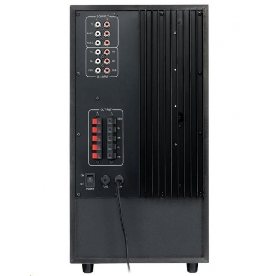 Systém reproduktorů v konfiguraci 5.1 nabízí celkový výkon 200 W. Sestava v dřevěném provedení je tvořena kvalitním subwooferem s 8" reproduktorem, který disponuje integrovaným zesilovačem a výkonem 75 W. Subwoofer je doplněn čtyřmi satelity a jedním středovým reproduktorem s výkonem 4 x 24 W + 1 x 30 W. Součástí balení je napájecí adaptér 100-240 V a dálkové ovládání.