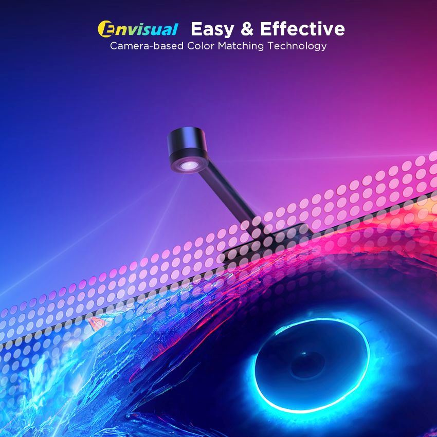 Speciální kamera s pokročilou technologií Envisual inteligentně rozpoznává a zachycuje barvy na obrazovce vaší televize nebo monitoru. Na základě této barevné analýzy automaticky vyhodnotí a nastaví ideální podsvícení. Užijte si synchronizaci barev bez zpoždění, aniž byste potřebovali HDMI kabel nebo byli omezováni streamovacími službami.