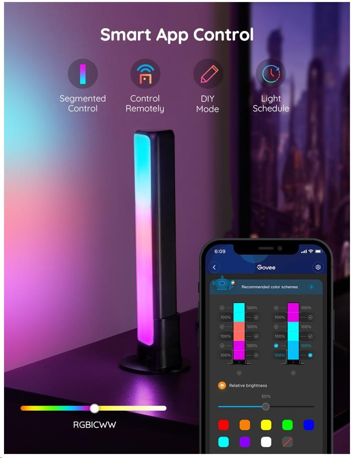 Spravujte nastavení barev a intenzity světla jednoduše pomocí aplikace Govee Home. Aplikace je zdarma ke stažení v Google Play a AppStore. Navíc získáte přístup k funkci časovače, DIY barvám, režimu videa, synchronizaci hudby a režimům scény. Světlo je možné ovládat i přímo na dodávaném Control boxu.