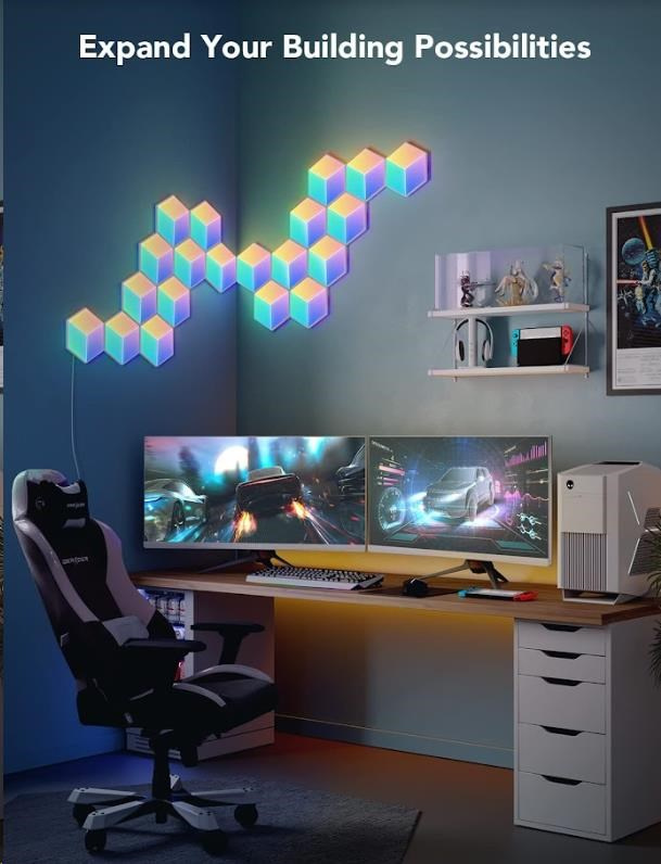 Vylepšete interiér a herní, filmové a hudební zážitky s designovým světlem Hexa PRO 3D Smart LED. Díky technologii RGBIC zobrazuje až 57 barev najednou. Barevnost si můžete nastavit po jednotlivých sekcích a kreativně si pohrát s 3D efektem osvětlení. Celkově umí zobrazit až 16 milionů barev s intenzitou 1-100%. Určitě si vyberete z mnoha režimů osvětlení a při poslouchaní oblíbené hudby si můžete zvolit také ze 6 rytmických režimů. Světla se ovládají hlasem přes Siri, Amazon Alexa nebo Google Assistant nebo přes aplikaci Govee Home na chytrém telefonu nebo tabletu. Světlo je určeno na instalaci na zeď a jeho tvar si můžete přizpůsobit podle vlastní fantazie. Jednoduchá instalace bez vrtání s životností až 50.000 hodin.