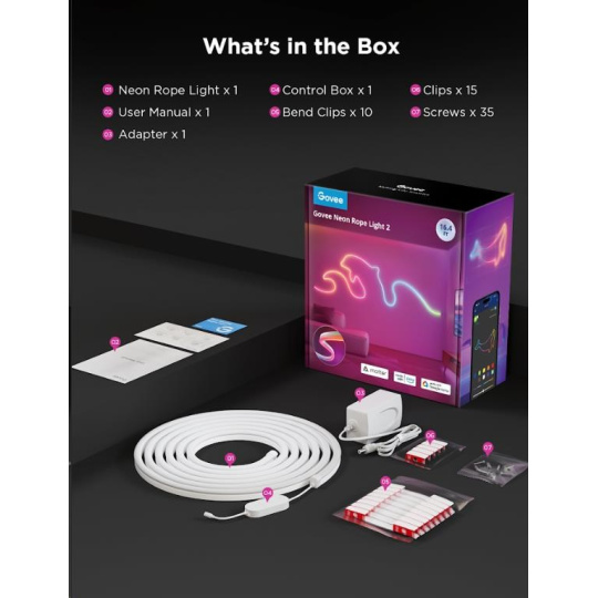 Instalace je velice jednoduchá pomocí samolepících klipů s 3M páskami. Nová generace neonových pásku je ještě ohebnější a tvarování je tak snazší. Vylepšeny byly i klipy a nabízí teď pevnější fixaci vymyšleného tvaru. Pro možnost maximální jistoty jsou v balení i šroubky. Govee Neon 2 je vhodné pro všechny místnosti a fantazii se meze nekladou!