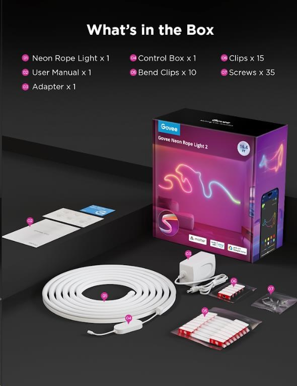 Instalace je velice jednoduchá pomocí samolepících klipů s 3M páskami. Nová generace neonových pásku je ještě ohebnější a tvarování je tak snazší. Vylepšeny byly i klipy a nabízí teď pevnější fixaci vymyšleného tvaru. Pro možnost maximální jistoty jsou v balení i šroubky. Govee Neon 2 je vhodné pro všechny místnosti a fantazii se meze nekladou!