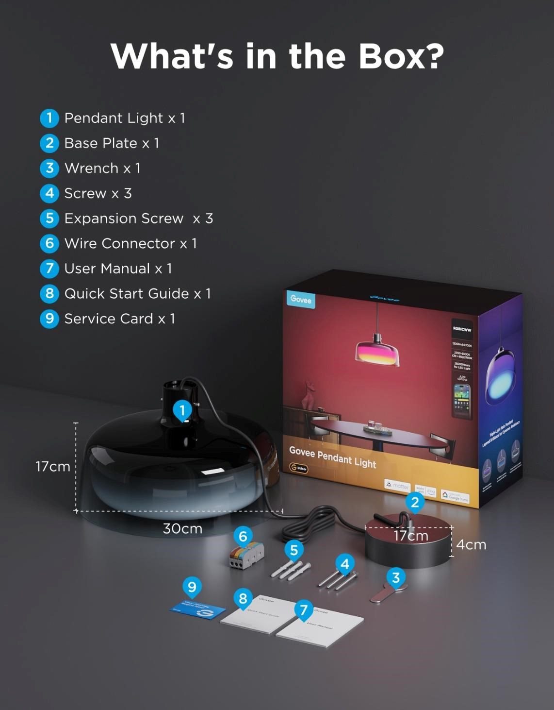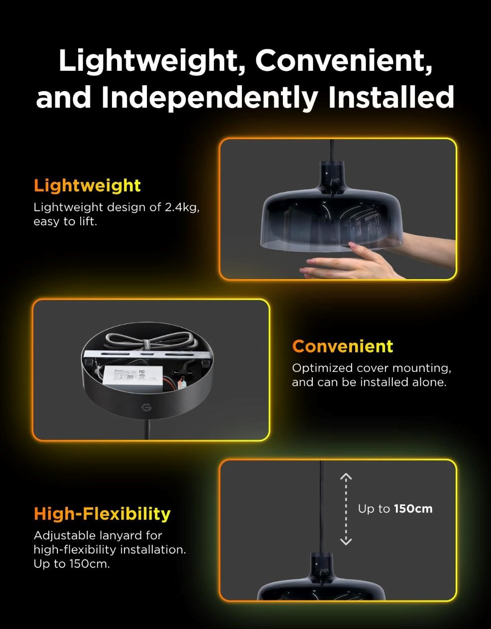 Govee Pendant Light je vybaven třístupňovým kruhovým osvětlením, které poskytuje 360° osvětlení s možností nezávislého ovládání každé zóny. Světlo je nastavitelné od teplé bílé 2700 K po studenou 6500 K a nabízí vysoký index podání barev (CRI 95). Instalace lustru je jednoduchá a díky nastavitelnému závěsnému kabelu až 150 cm si jej snadno přizpůsobíte výšce svého stropu.