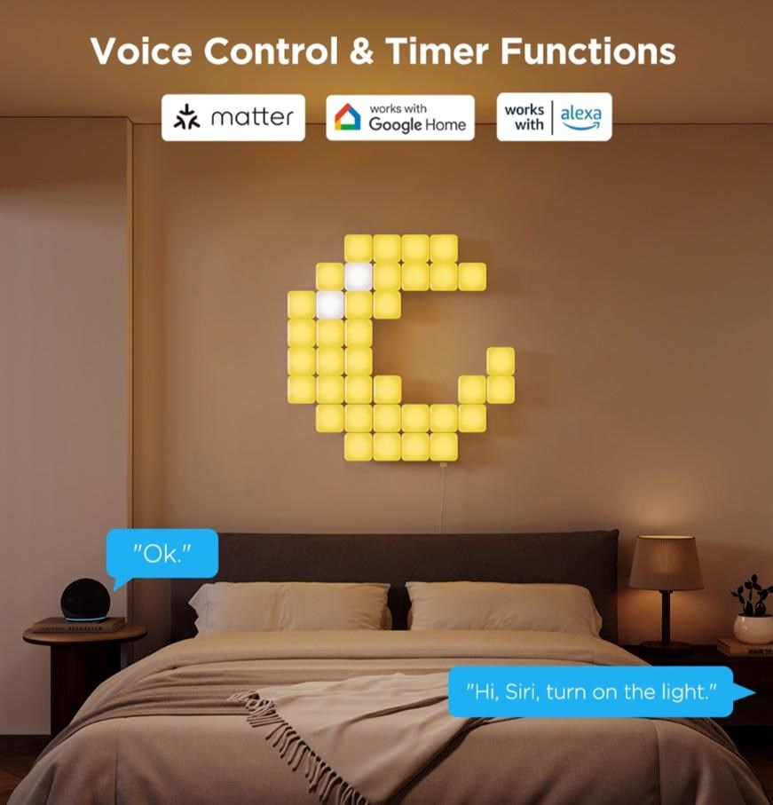 Užijte si pohodlí chytrého ovládání díky kompatibilitě s Matter, Google Home, Amazon Alexa a Siri. Stačí jediný hlasový příkaz, a vaše Govee Mini Panel Lights se přizpůsobí přesně vašim potřebám – ať už jde o zapnutí, změnu barev nebo nastavení intenzity. S funkcí časovače můžete snadno naplánovat osvětlení podle vašeho denního rytmu a vytvořit ideální atmosféru kdykoliv.