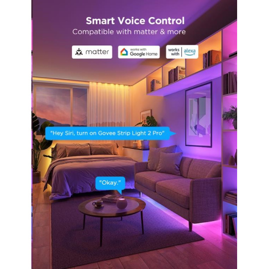 Govee LED Strip Light 2 Pro je vybaven in-house vyvinutým řídicím čipem G1151, který zajišťuje bezproblémovou a rychlou kontrolu světelných efektů. Diody RGBWWIC 5v1 poskytují perfektní reprodukci barev a dokonalé podání bílé barvy od teplé po studenou, hustota je 60 led na 1 metr. Pásek podporuje protokol Matter, což umožňuje bezproblémovou kompatibilitu s většinou Smart Home systémů s chytrými asistenty jako Google Assistant, Siri a Alexa, takže ji můžete snadno integrovat do své chytré domácnosti. Díky aplikaci Govee Home získáte plnou kontrolu nad barvami, jasem a segmenty LED pásky, přičemž je možné rozdělit pásku až na 6 segmentů na metr pro dokonalé barevné gradienty a personalizaci.