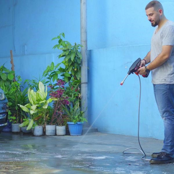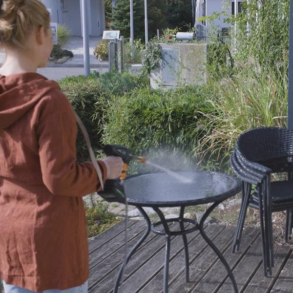 Širokoúhlá stříkací tryska akumulátorového vysokotlakého čističe je ideální pro čištění velkých ploch, zalévání zahrady, mytí auta a další.