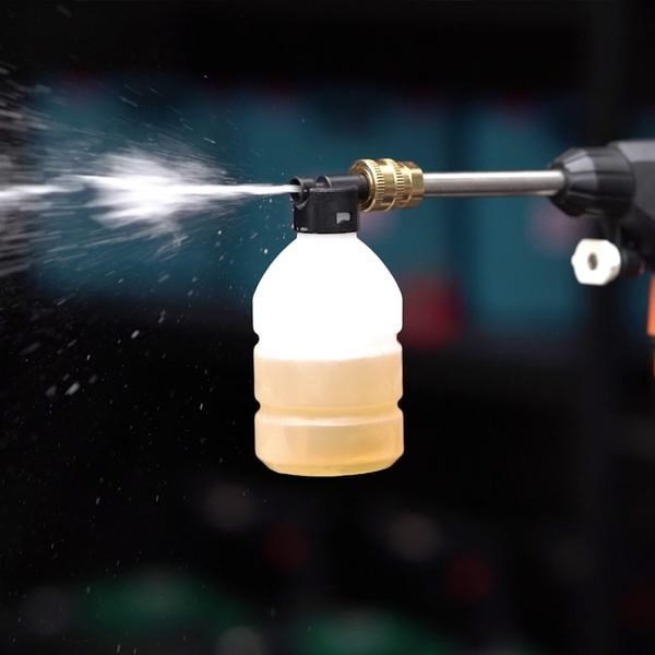 Připojitelná láhev s mýdlovou pěnou umožňuje naplnit čisticími prostředky a účinně napěnit povrchy pro ještě lepší výsledky. Širokoúhlá tryska usnadňuje čištění velkých ploch, zatímco přesná tryska umožňuje cílené, bodové čištění.