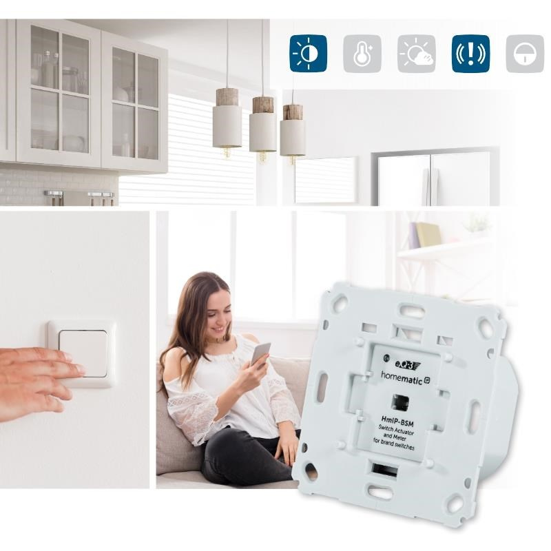 - Spínací akční člen (HmIP-BSM) disponuje na každém ze dvou tlačítek kolébkového vypínače dvěma kanály, které dokáží rozlišit mezi dlouhým a krátkým stisknutím tlačítka. To umožňuje například zapínat světelné zdroje i jen po určitou dobu.