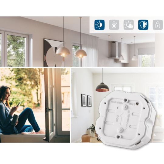 Programovatelný bezdrátový Spínací akční člen s měřením (HmIP-BSM-I) pro zápustnou montáž, napájený ze sítě 230 V, je součástí systému chytré domácnosti Homematic IP.