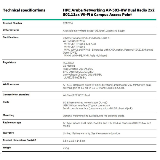 HPE Aruba Networking AP-503-RW Dual Radio 2x2:2 802.11ax Wi-Fi 6 Campus Access Point (Includes Mount Bracket) R8M98A