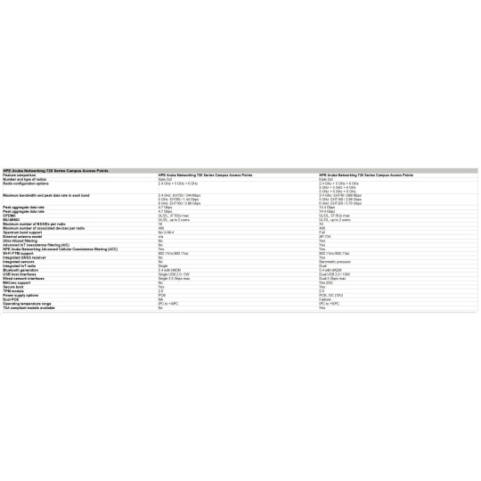Designed to deliver cutting-edge Wi-Fi performance, the HPE Aruba Networking 720 Series Campus Access Points offer enterprises a cost-effective solution that meets the demand for fast, secure, high-performance connectivity. Leveraging the latest Wi-Fi 7 standard, these access points enhance security across both wired and wireless networks, support Internet of Things (IoT) devices, and provide accurate location-aware capabilities. HPE Aruba Networking Central helps drive efficient operations and provides AI-automation and machine learning (ML) insights for fine-tuned wireless connectivity across diverse environments. Like all the HPE Aruba Networking access points, this series is Wi-Fi CERTIFIED and includes a limited lifetime warranty for investment protection.