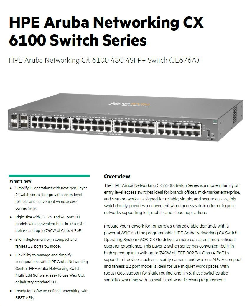 HPE Aruba Networking CX6100 48G 4SFP+ Switch RENEW JL676A
