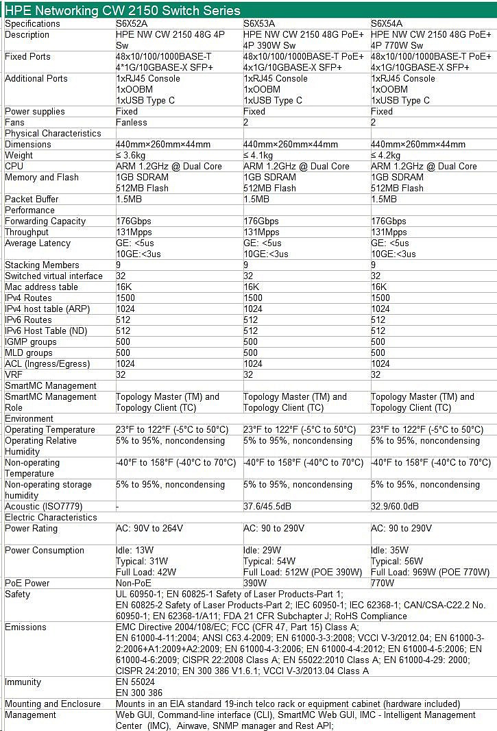 HPE Networking CW 2150 48p 10M/100M/1G PoE+ 4p SFP+ 1G/10G 390W Switch