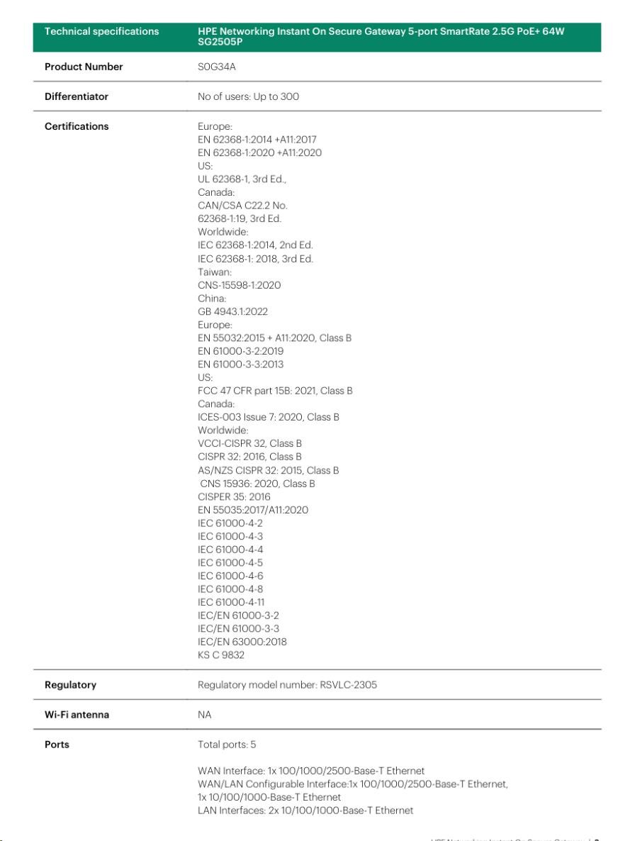 HPE Networking Instant On Secure Gateway SG2505P(S0G34A)