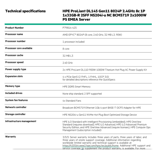 | HPE ProLiant DL145 Gen11 8024P 2.4GHz 8c 1P1x32GB-R 2SFF NS204i-u NC BCM5719 2x1000WPS Server |