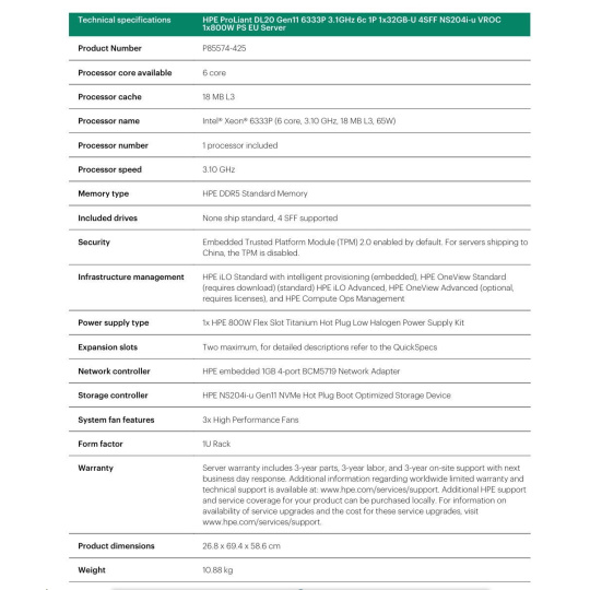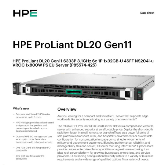 HPE PL DL20 gen11 6333P (3.1G/6C12T) 1x32G (P64339) 4SFF NS204i-u (2x480Gnvme) VROC 1x800W 4x1G NBD333 Smart Choice.