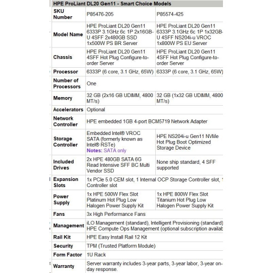 HPE PL DL20g11 6333P (3.1G/6C12T) 1x32G (P64339) 4SFF NS204i-u (2x480Gnvme) VROC 1x800W 4x1G NBD333 Smart Choice